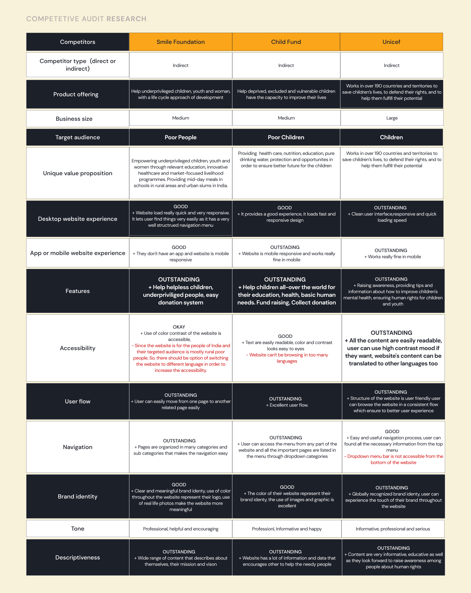 As this project is for social good, I didn’t consider the other organizations as my direct competitors. After doing the competitive audit, I found some areas of improvement.