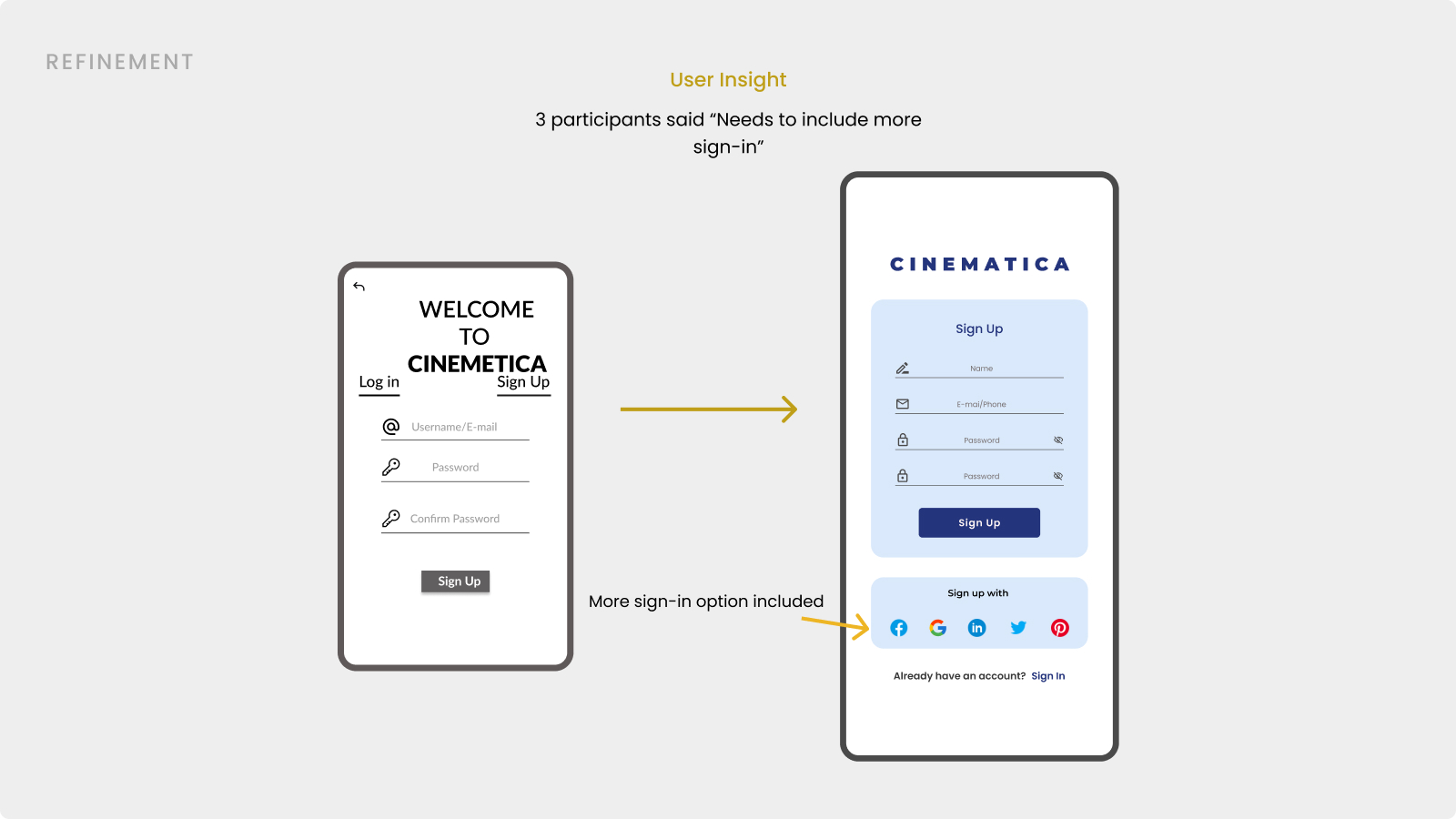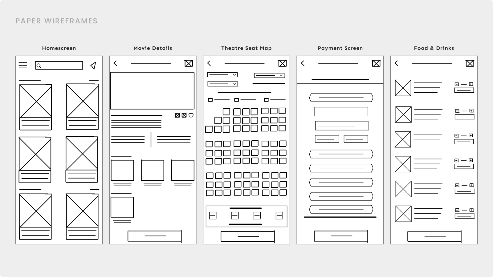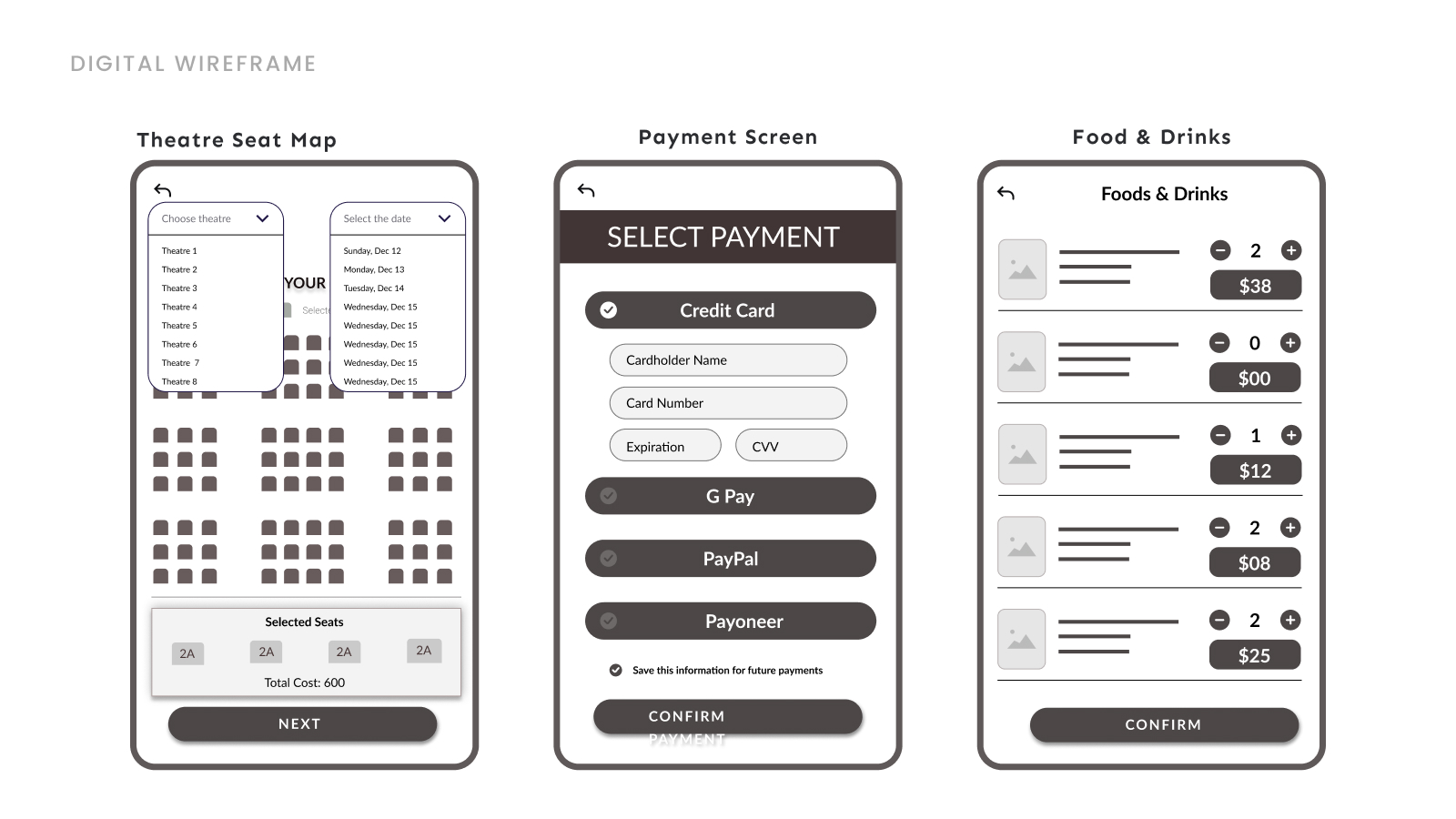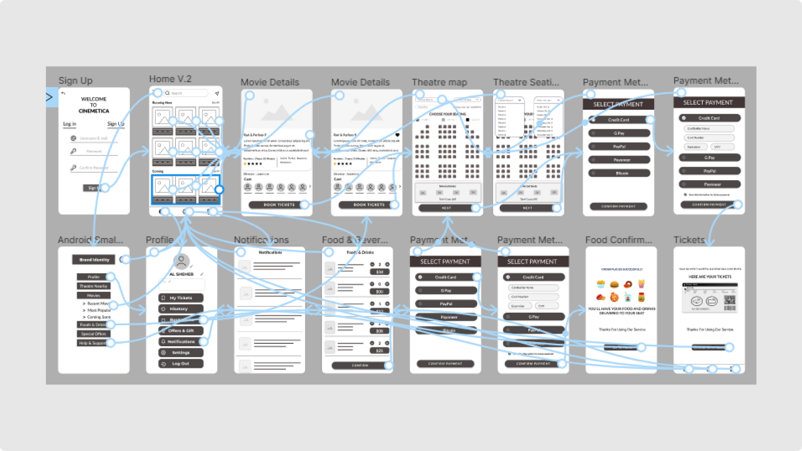 The user flow of this prototype was made to make sure that a user can finish all the processes to book a movie ticket. Users are able to select movies, select the closest theatre, and choose preferred seats, they also have the privilege to order food & drinks for the theatre.