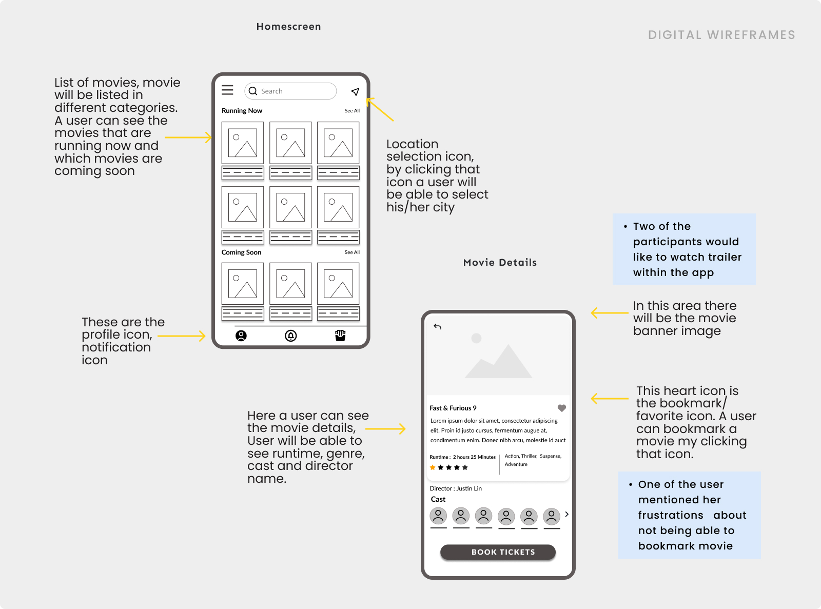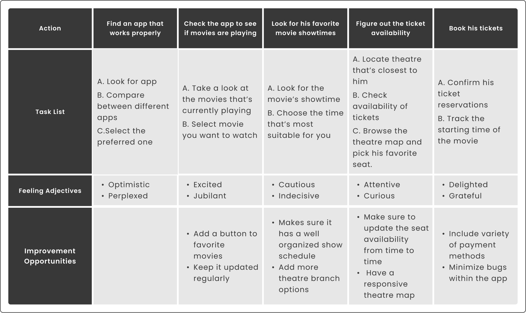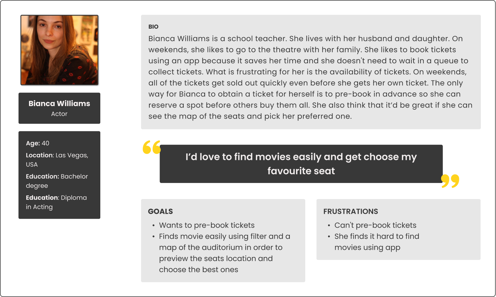 Initially, I had to do user research for creating a persona. By creating the persona, I got to know the frustrations that a user faces while booking movie tickets and what kind of features they would like to see in a movie seat reservation app.